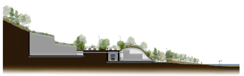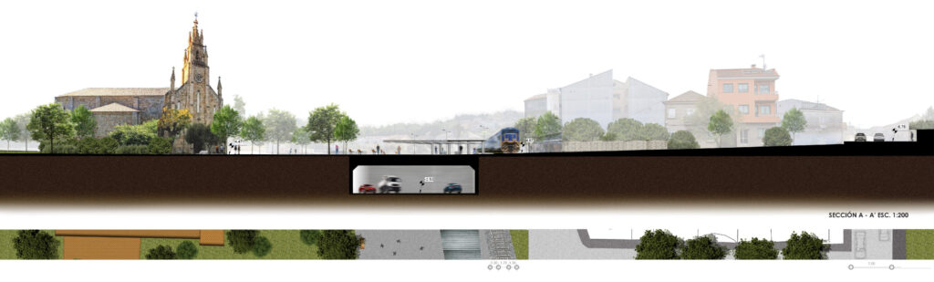 - [1] O soterramento das vías de acceso ao porto e a Marín é un elemento imprescindible para a rexeneración ambiental do núcleo de os Praceres e a humanización praza da Igrexa de Santo André. Tamén se mellora a seguridade peonil respecto ao paso a nivel do tren e incorpórase un equipamento social.