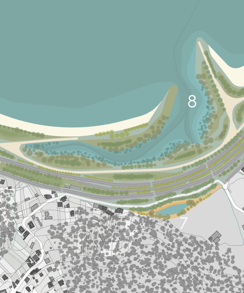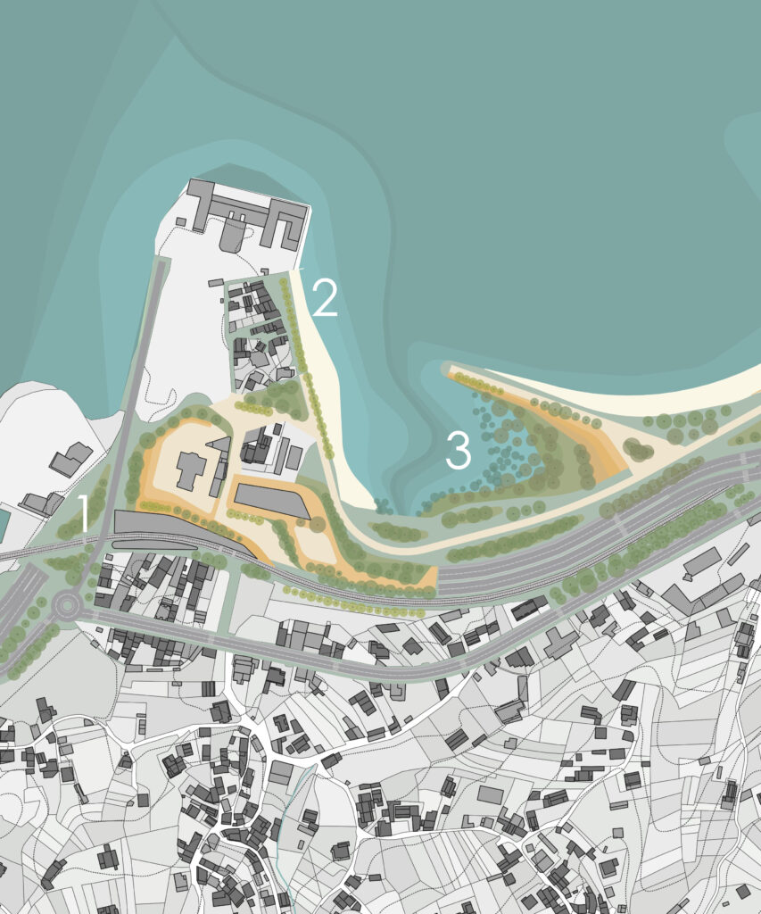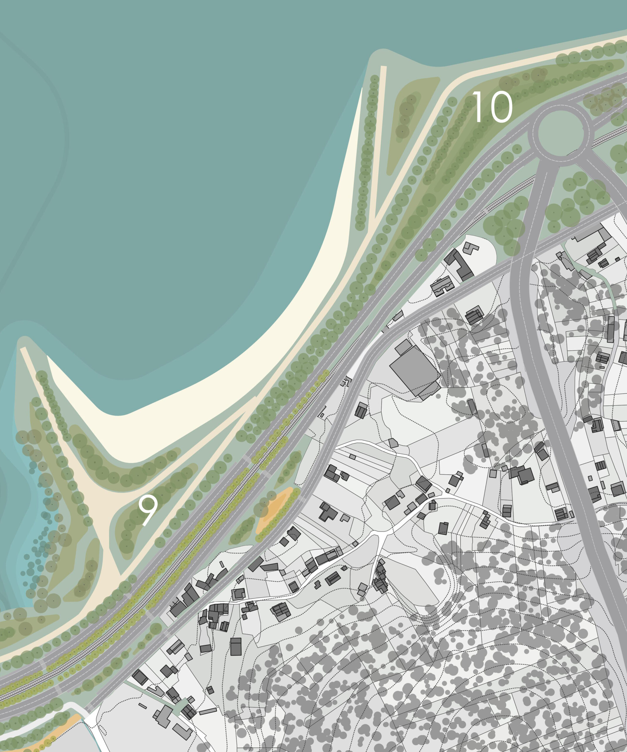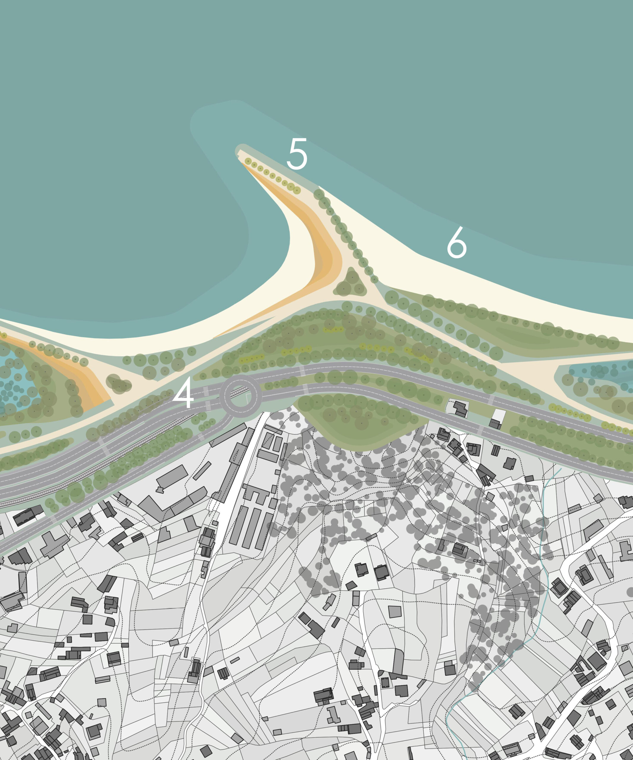 - [6] Sistema de praias e dunas, con diferentes orientacións (noroeste e nordeste) para mellorar a incidencia do sol e protección aos vento cando sexa necesario