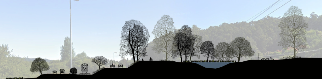 - [9] Constrúese unha nova topografía, inspirado nos sistemas dunares e litorais. Intercálanse suaves promontorios e outeiros con chairas . Deste xeito a percepción da paisaxe non é homoxénea senón que se crean múltiples perspectivas, facendo o percorrido máis interesante.