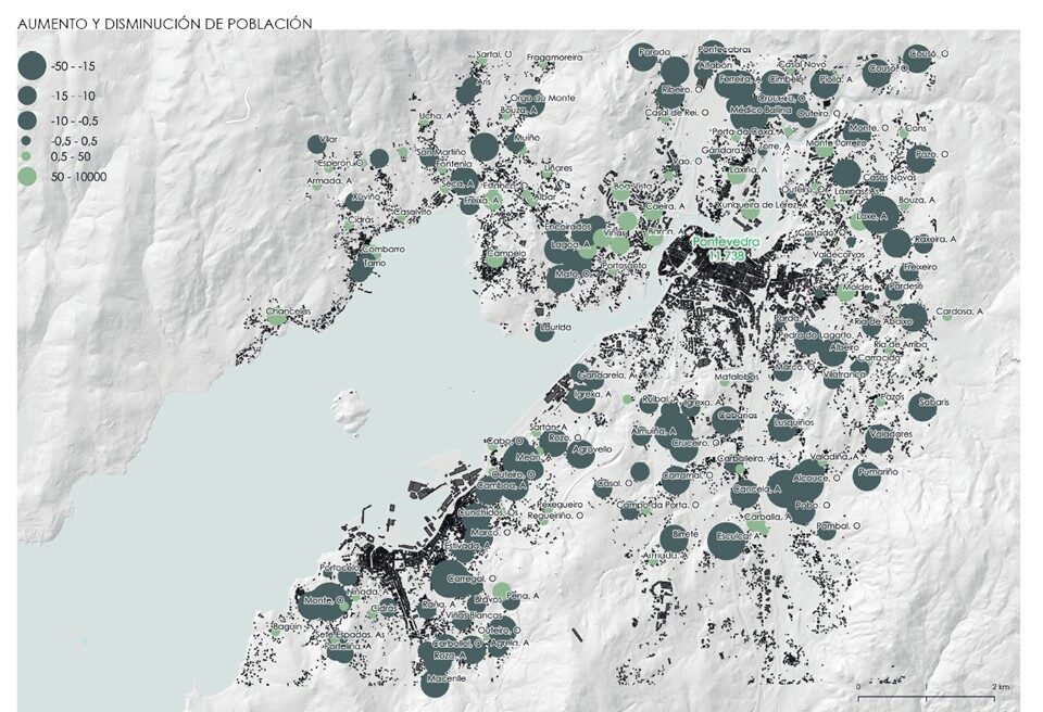 O estudo das dinámicas demográficas mostra un proceso significativo de perda de poboación, contrario ao que veu sucedendo noutras áreas metropolitanas, nas que as áreas periurbanas foron absorbendo a poboación que non atopaba acomodo no centro das cidades. Nas últimas dúas décadas os núcleos máis próximos a fábrica de Ence perderon o 25% da súa poboación. As nove vilas da fronte litoral entre As Cocheiras e Os Placeres perderon máis de 260 habitantes, destacando este último, que sufriu un descenso do 34% da poboación (150 habitantes menos). Os núcleos da aba de Salcedo tamén perderon poboación, pero nunha proporción inferior ao 20%.