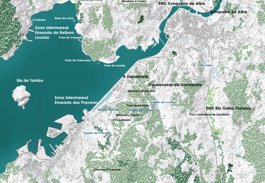 Pedrayo describe a paisaxe anterior a Ence (a primeira edición da Guía de Galicia é de 1926), antes de que a fábrica destrúa as praias e os eucaliptos ocupen a illa de Tambo e os montes galegos. Aínda así, a contorna de Lourizán ten un gran potencial natural e paisaxístico, que pode ser recuperado por medio da re-naturalización do recheo, unha vez expire a concesión que permite a permanencia da fábrica. Os miradoiros naturais (Monte Sino, Rozo, Pornedo…) que proporcionan a sucesión de suaves promontorios están actualmente afectados polo impacto visual, acústico e olfativo, da celulosa.