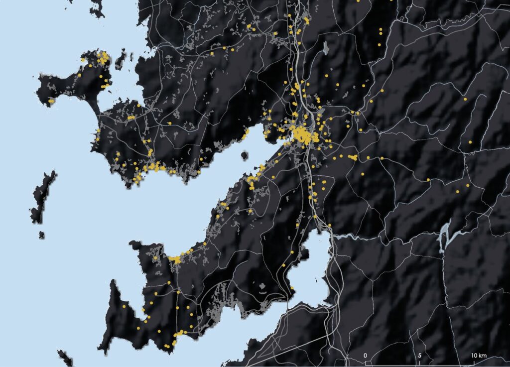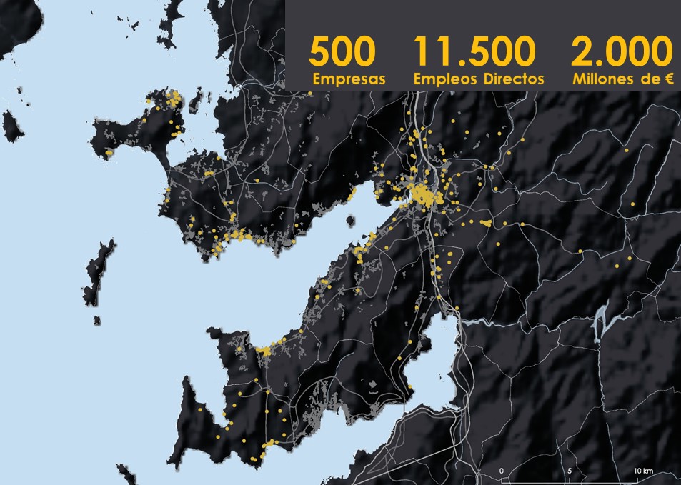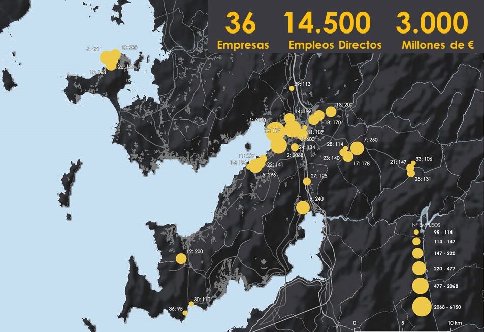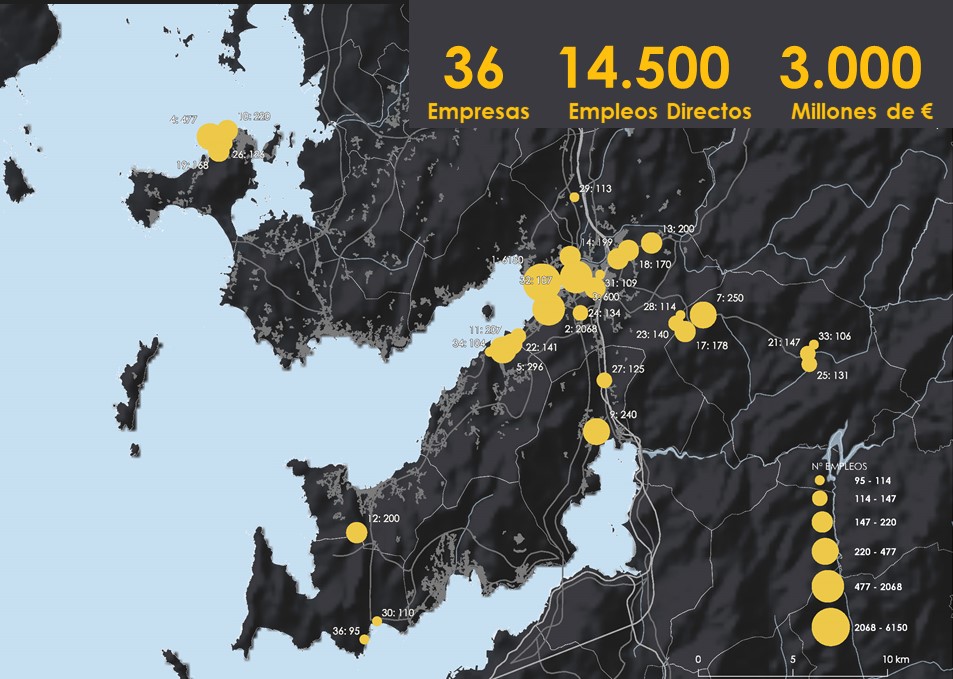 A falta de estudos e datos independentes o traballo realizado tratou de establecer un marco comparativo para relativizar o peso da fábrica de celulosa na comarca, usando datos reais. En primeiro lugar creamos un mapa coa localización das 36 empresas da ría que máis emprego xeran e que teñen a súa sé principal nalgún dos concellos que bordean a Ría de Pontevedra. Segundo os datos do ano 2021, esas 36 empresas mantiveron 14.564 empregos directos e ingresaron máis de 3 mil millóns de euros, só nese ano. As 36 empresas, que teñen entre 95 e máis e 6.000 empregados, ocupan un diverso abanico de actividades (26), que van dende a distribución de alimentos ao téxtil, a pesca, conserva e procesado de pescado, fabricación naval, compoñentes de vehículos, transporte de pasaxeiros ou avicultura.